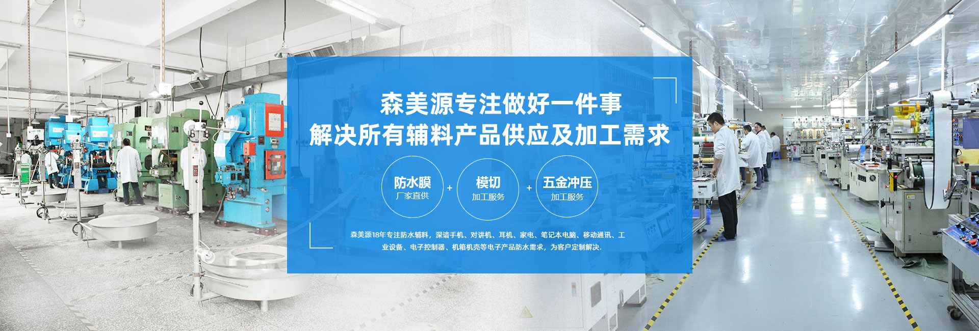 森美源位于深圳寶安大浪路鴻源工業(yè)園,占地面積5400平米,工廠擁有日本,臺(tái)灣進(jìn)口和國(guó)產(chǎn)模切機(jī)25臺(tái)及4條成熟模切組合QDC線。工廠主要用于研發(fā)生產(chǎn):電子通訊防水膜,保護(hù)膜(喇叭防水膜,咪頭防水膜聽筒防水膜,手機(jī)防水膜各防水雙面膠)以及電子通訊的防塵防震產(chǎn)品。